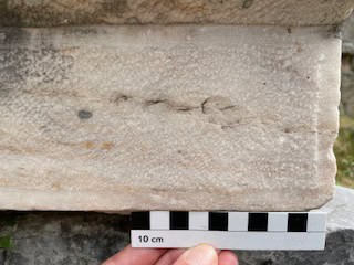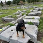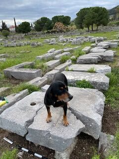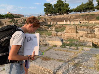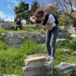 Manchmal arbeite ich auch vor Ort an meinem Material in Griechenland. Dann sieht mein typischer Tag anders aus: Ich wohne während meines Aufenthalts mit anderen Wissenschaftler*innen im Ausgrabungshaus. Das ist ein bisschen wie in einer Jugendherberge: geteilte Zimmer und Bäder, gemeinsames Essen zu bestimmten Zeiten (Frühstück, Mittagessen und Abendessen). Da ich zu Architektur arbeite, sind viele meiner untersuchten Bauglieder aus Stein und befinden sich entweder eingelagert im Depot oder im Museum, oder draußen im Ausgrabungsgelände. Ausgestattet mit einer ordentlichen Ladung Sonnencreme und viel Wasser, einer Kamera für Fotos und verschiedenen Werkzeugen und Utensilien zum Vermessen verbringe ich dann meinen Arbeitstag draußen bei „meinen Steinen“ in der griechischen Sonne. Ab und zu quatsche ich mit Tourist*innen und den anderen Wissenschaftler*innen, die vor Ort arbeiten, und bekomme Besuch von Hunden, die im Ort und im Ausgrabungsbereich leben. Das ist immer total schön!