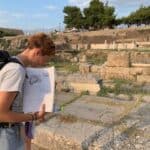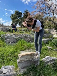 Als Archäologin mache ich ganz viele unterschiedliche Sachen: In meiner Doktorarbeit untersuche ich das Aussehen von Bauten und kleineren Monumenten. Hierbei interessiert mich, aus welchen Materialien sie gebaut waren, wie sie sich ins Design von Stadtzentren einfügten, wer sie erbauen ließ und wer sie nutzte. Das mache ich sowohl vor Ort und vermesse, dokumentiere und fotographiere die Überreste der Gebäude, als auch am Schreibtisch in der Theorie (zum Beispiel durch Vergleiche mit anderen antiken Städten). Manchmal arbeite ich auch bei Ausgrabungen mit und bin dann mehrere Wochen im Sommer in Griechenland mit vielen anderen Studierenden und Wissenschaftler*innen. Als großes internationales Team arbeiten und wohnen wir dann zusammen – immer ein bisschen wie Klassenfahrt! Neben meiner Doktorarbeit arbeite ich auch im Archäologischen Museum und biete dort Führungen und Workshops an.