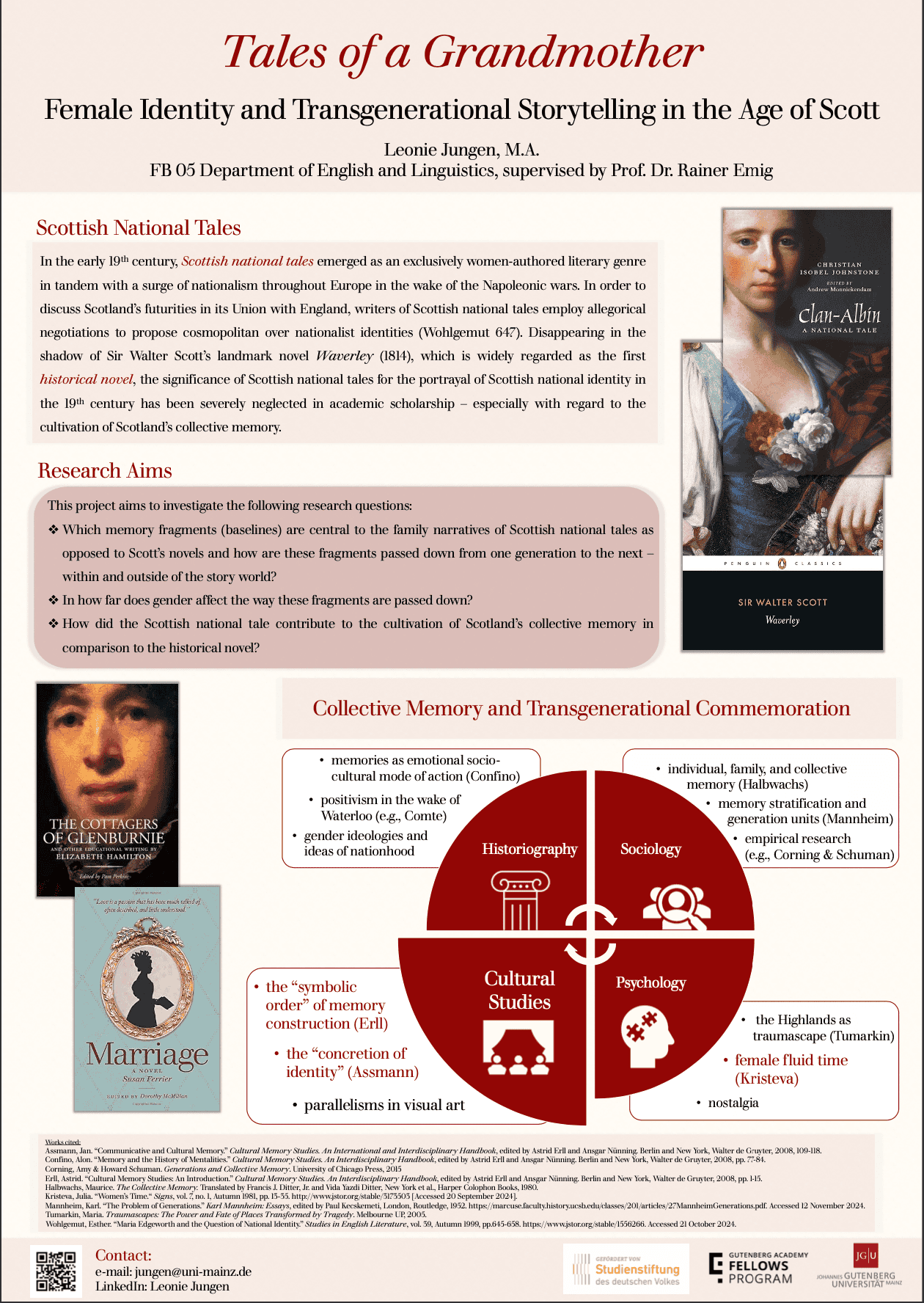 Seit 2021 promoviere ich an der Schnittstelle von Englischer Literatur und Erinnerungskultur an der Johannes Gutenberg-Universität in Mainz. Am Beispiel der schottischen Nationalerzählungen (Scottish national tales), einem Genre, das ausschließlich von schottischen Frauen geschrieben wurden, untersuche ich, wie die Familie als Metapher für den Nationenbund von Schottland und England diente und welche Rolle die Frauen, insbesondere Mütter einnehmen. Frauen hatten zum damaligen Zeitpunkt weder die Staatsbürgerschaft noch eine politische Mitsprache und wählten so die Literatur, um ihre Zukunftsvisionen zu diskutieren. Gleichzeitig wurden Begriffe wie „Nation“ und „Familie“ mit dem aufkommenden Kapitalismus und Konservatismus gesellschaftlich neu definiert. Leider sind diese Werke im kulturellen Gedächtnis Großbritanniens nahezu vollständig verschwunden. Mich interessiert, warum das der Fall ist, inwiefern das Geschlecht der Autorinnen damit zusammenhängt und wie das noch heute kulturelle Narrative beeinflusst.